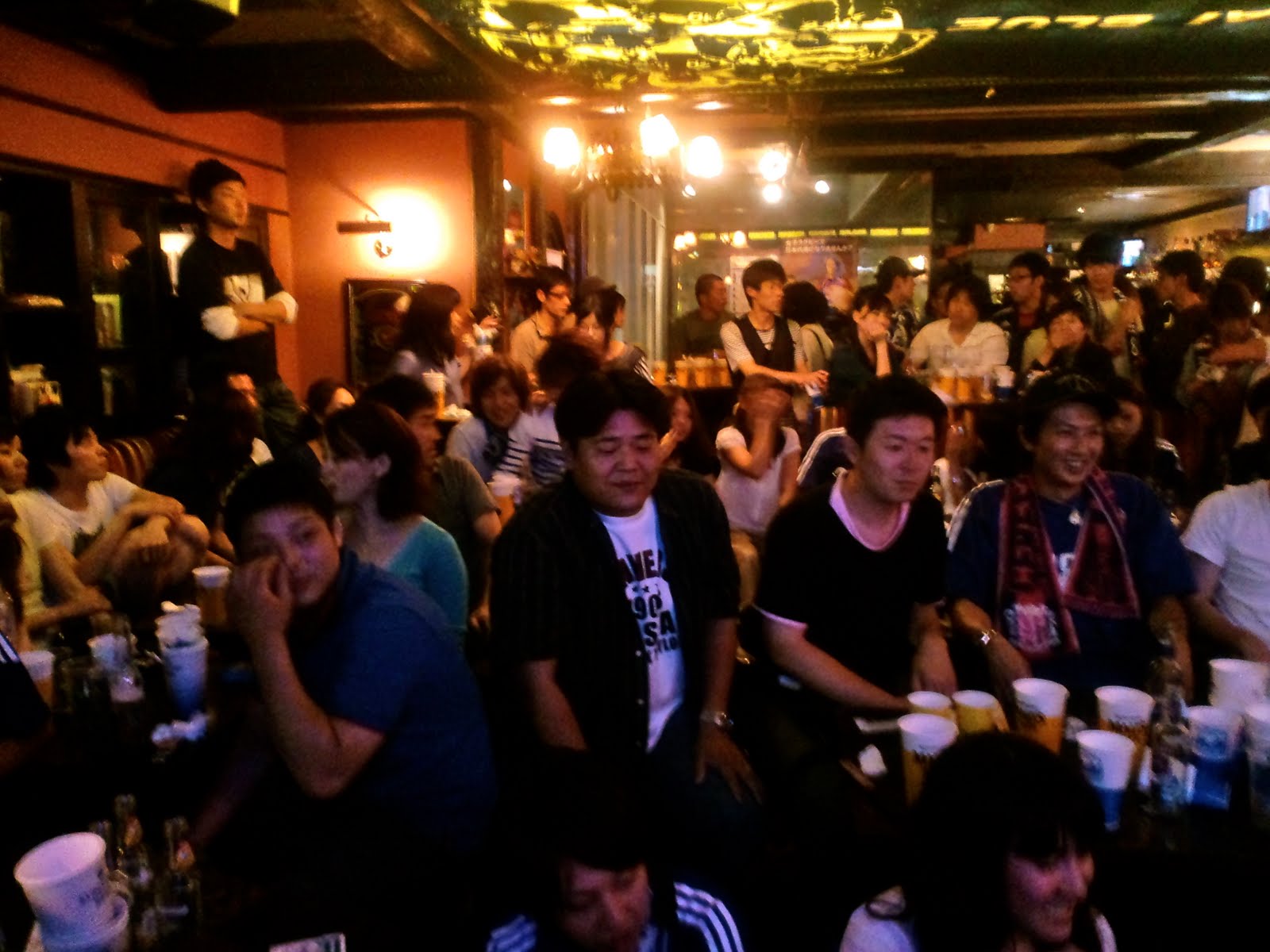So the following week we went to the Pig and Whistle, another English bar not far from the Hub. This was for the Japan Netherlands game. We expected pretty much everywhere to be packed and charging cover, which was exactly the case here. It cost 3000 yen (about $30), but it came with 3 drink tickets and one food or drink ticket, which is actually really good for a Japanese bar. At some point a few people convinced me to stay out all night. Here's some pictures: